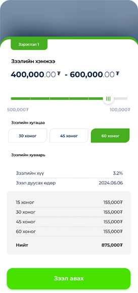 Та TCash апп-г ашиглан гар утаснаасаа 5 минутын дотор 1 сая төгрөг хүртэлх зээлийг 7 хоногийн 24 цагийн аль ч үед шимтгэлгүйгээр, барьцаагүйгээр дансандаа шууд шилжүүлэн авах үйлчилгээ юм.